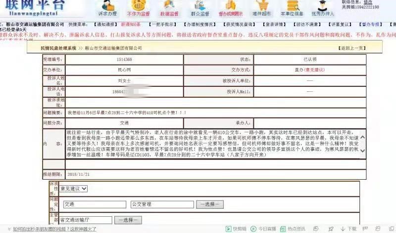 劉女士在反饋件上寫到:各位相關(guān)領(lǐng)導(dǎo),你們好!事情的經(jīng)過是這樣:我母親早晨在鐵西八家子等車,由于不知道八家子這個(gè)站點(diǎn)已經(jīng)不停站,等了30多分鐘,經(jīng)過好心人的提醒就往前一站行走,由于早晨天氣特別冷,老人在行走的途中就看見一輛410公交車,一路小跑,其實(shí)這時(shí)車已經(jīng)到達(dá)站點(diǎn),本可以開走,但是看到我母親一路小跑還帶那么多東西,在車站等待我母親上車才開走,如果司機(jī)師傅不停車等待,在寒風(fēng)瑟瑟的早晨,我母親不知道又要等待多久!我母親在車上多次感謝司機(jī),并要詢問姓名表示一定要寫感想信,但司機(jī)師傅卻做好事不留名,這是一種什么精神!我覺得新時(shí)代鞍山應(yīng)該需要這樣為老百姓著想還不留名的好司機(jī)!我為他點(diǎn)贊!也懇請(qǐng)公交公司的領(lǐng)導(dǎo)多宣揚(yáng)這個(gè)人的事跡,為寒風(fēng)瑟瑟的秋季增加一絲溫暖!車牌號(hào)碼是遼CD1503,早晨7點(diǎn)28分到的二十六中學(xué)車站(八家子方向開來)。