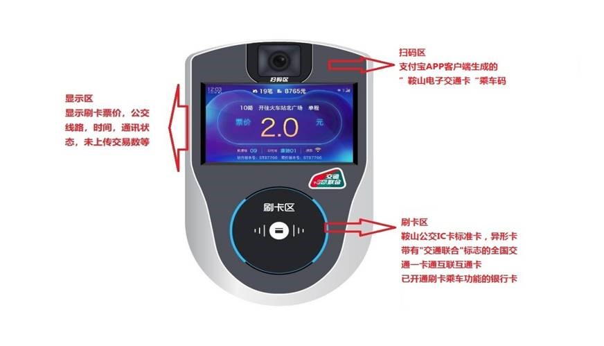 新型“掃碼支付”設(shè)備分三個(gè)區(qū)域。 上方為掃碼區(qū):支持支付寶客戶端生成的鞍山電子交通卡乘車碼。 中間為顯示區(qū):可顯示刷卡票價(jià)、日期、時(shí)間、線路信息、站點(diǎn)信息、通信情況等信息。 下方為刷卡區(qū):支持鞍山公交IC卡標(biāo)準(zhǔn)卡、異形卡、帶有“交通聯(lián)合”標(biāo)志的全國(guó)交通一卡通互聯(lián)互通卡以及已開通刷卡乘車功能的銀行卡。 用戶現(xiàn)階段需擁有一部可安裝支付寶的智能手機(jī)。 方式一 四步操作、掃碼出行: 第一步 下載并安裝支付寶APP客戶端; 第二步 打開APP進(jìn)行實(shí)名登記和認(rèn)證; 第三步 在支付寶首頁(yè),打開“掃一掃”,掃下面二維碼